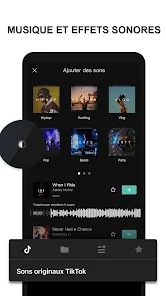 • Ajout de musique : Les utilisateurs peuvent ajouter de la musique à leurs vidéos à partir d’une bibliothèque intégrée ou de leur propre bibliothèque de musique.